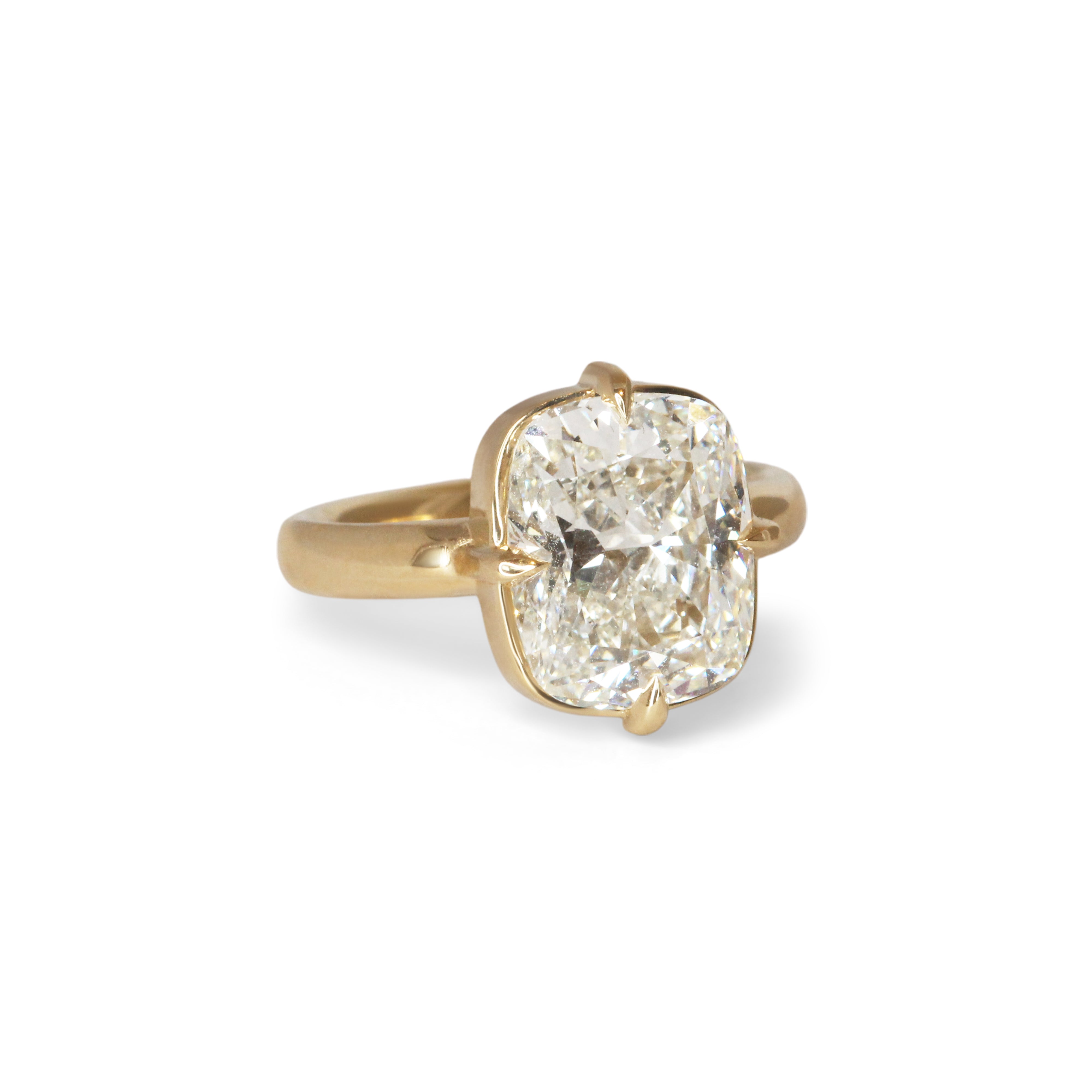 Cushion lab grown diamond set with long claw prongs on our signature comfort fit ellipse band. A bold & modern engagement ring with a low profile, practical for everyday wear.