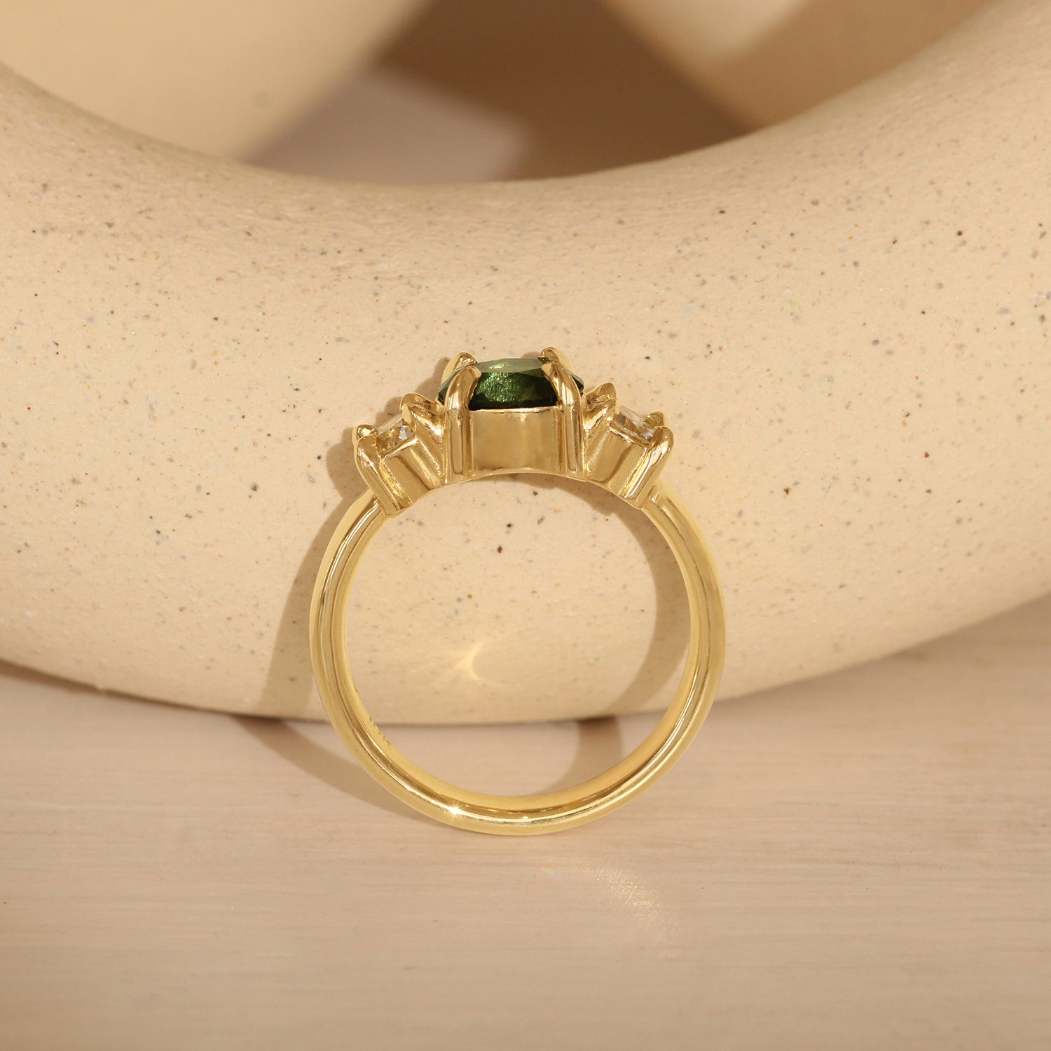 Oval sapphire & antique old mine diamonds set with long claw prongs on our signature comfort fit ellipse band. A bold & modern 3 stone engagement ring with a low profile, practical for everyday wear.