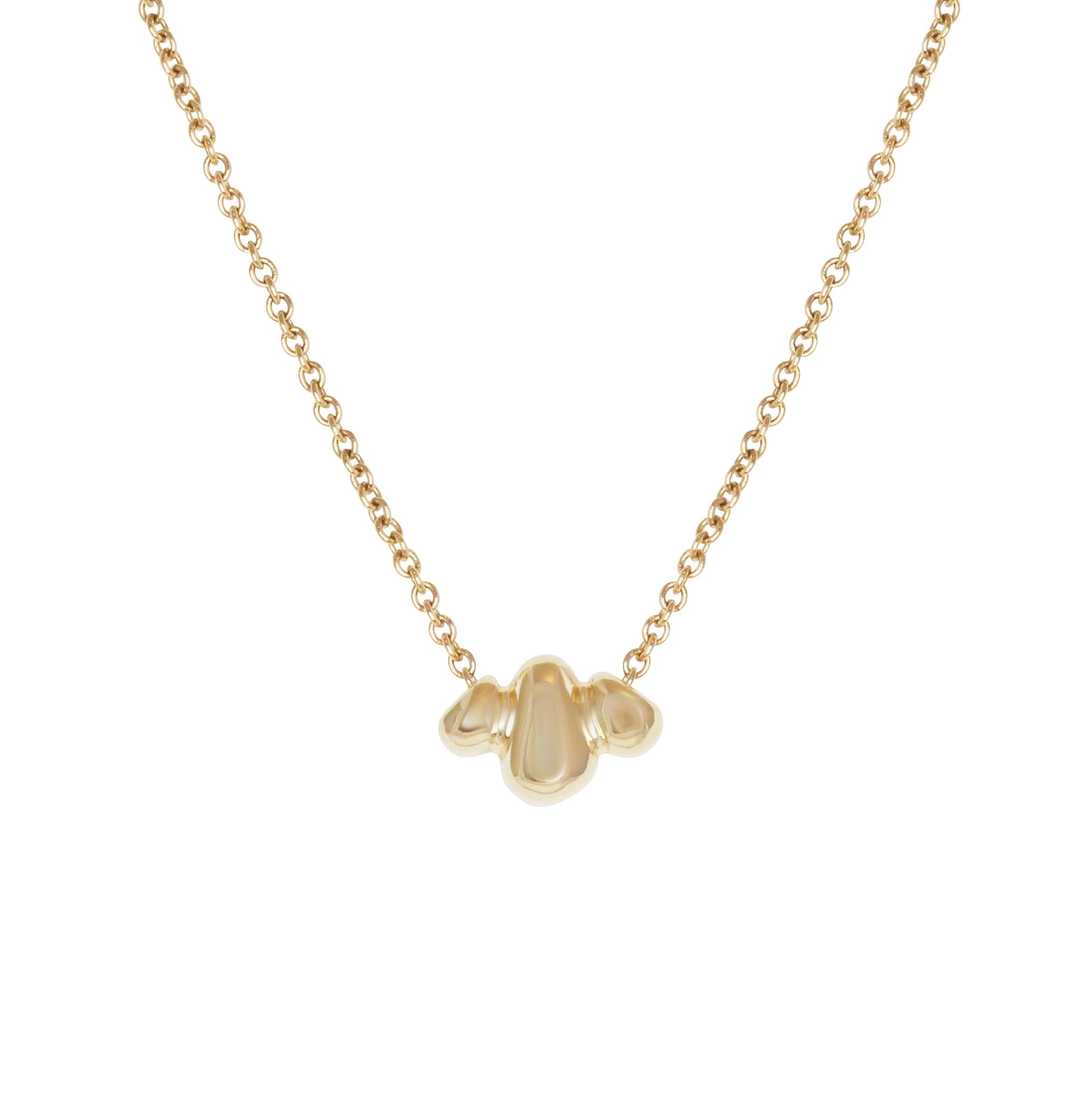 A soft, pebble textured pendant evokes the ancient Ruins, suspends elegantly from a classic solid gold cable chain. A slider charm that moves with you.