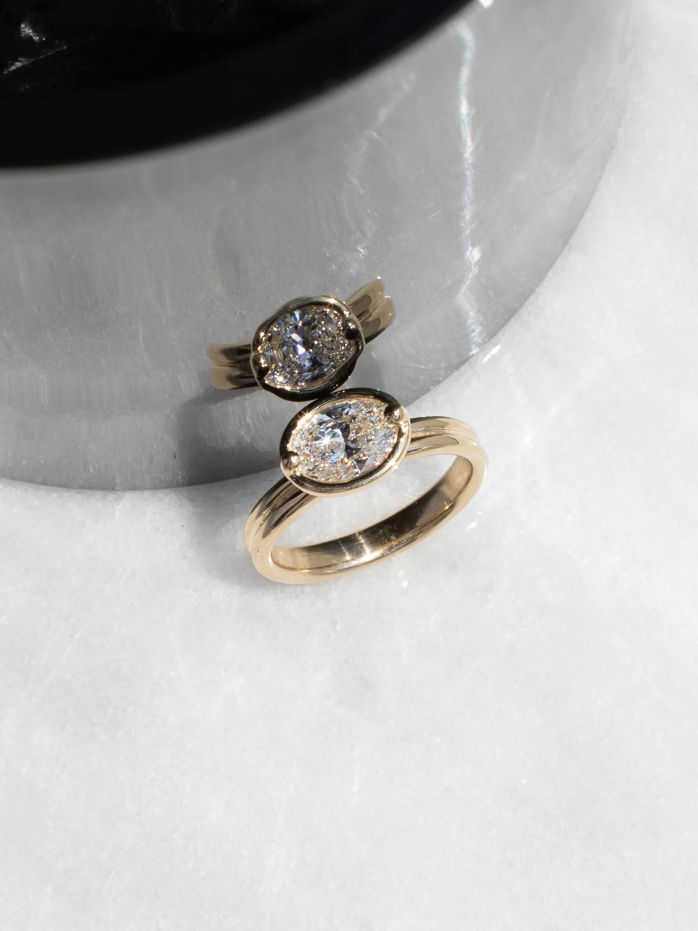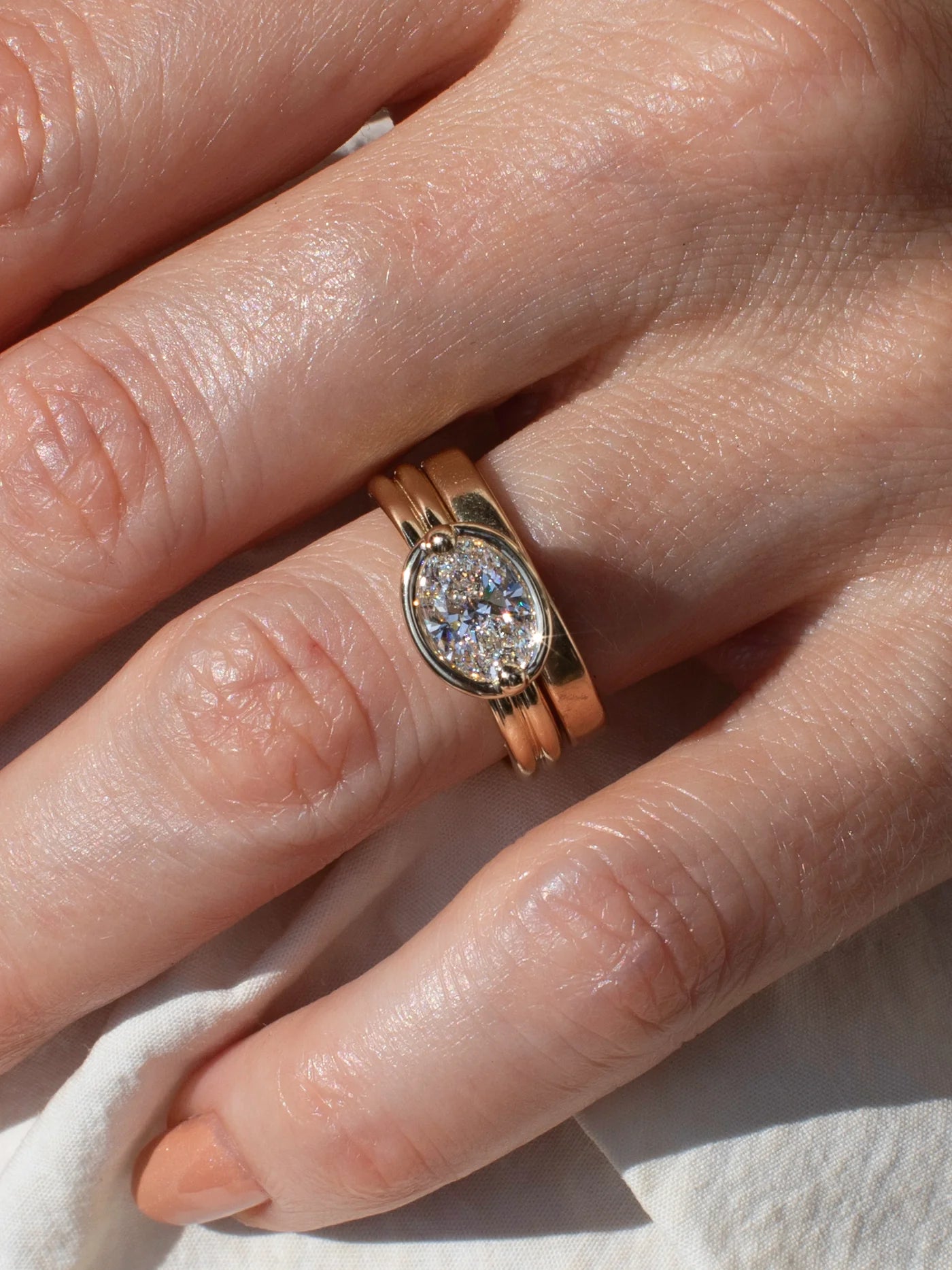 Low profile bezel-set engagement ring on a double band.